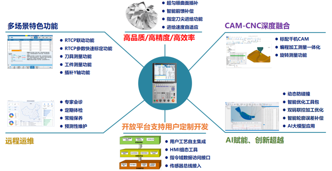 支持专家会诊、定期体检、常规保养及预测性维护,减少停机损失;RTCP联动及参数快速标定、刀具与工件测量、插补Y轴、用户工艺自主集成等功能,满足个性化加工需求;开放的HMI组态工具和指令域数据访问接口,支持用户定制开发与传感器总线接入,适配多样化应用场景。