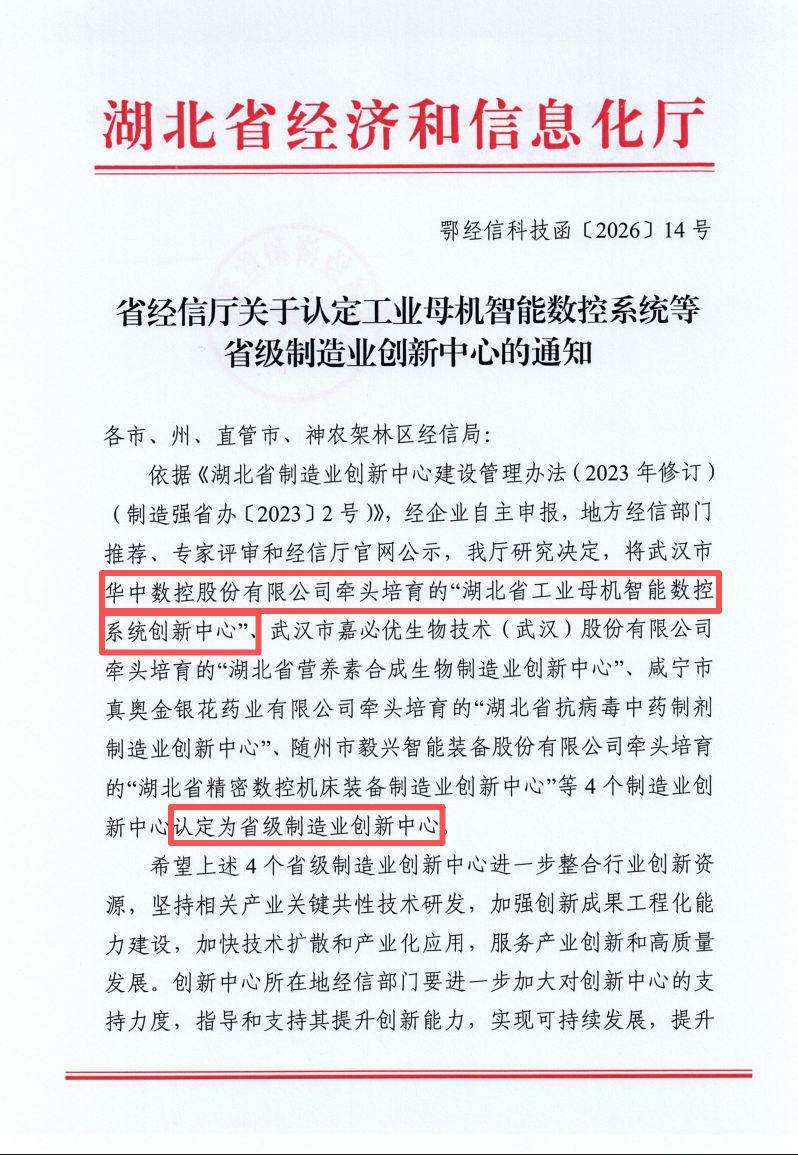 依据《湖北省制造业创新中心建设管理办法(2023年修订)(制造强省办〔2023〕2号)》,经企业自主申报,地方经信部门推荐、专家评审和经信厅官网公示,我厅研究决定,将武汉市华中数控股份有限公司牵头培育的“湖北省工业母机智能数控系统创新中心”等4个制造业创新中心认定为省级制造业创新中心。