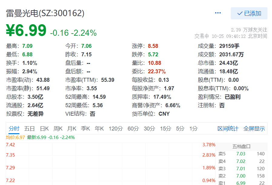 兰兰 10月25日,截至9:40,雷曼光电(300162.SZ)跌2.24%,报6.99元,总市值为24.43亿元。
