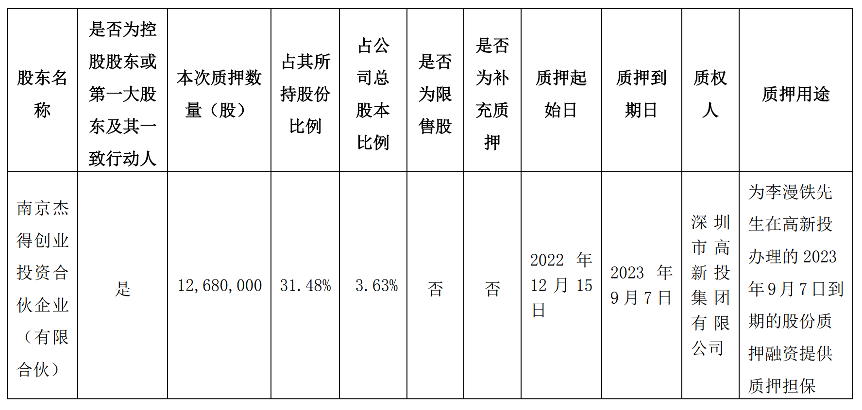 公告显示,雷曼光电接到公司控股股东一致行动人之南京杰得创业投资合伙企业(有限合伙)的函告,获悉上述股东近日办理了股份质押业务。本次质押1268万股,占雷曼光电总股本比例为3.63%。