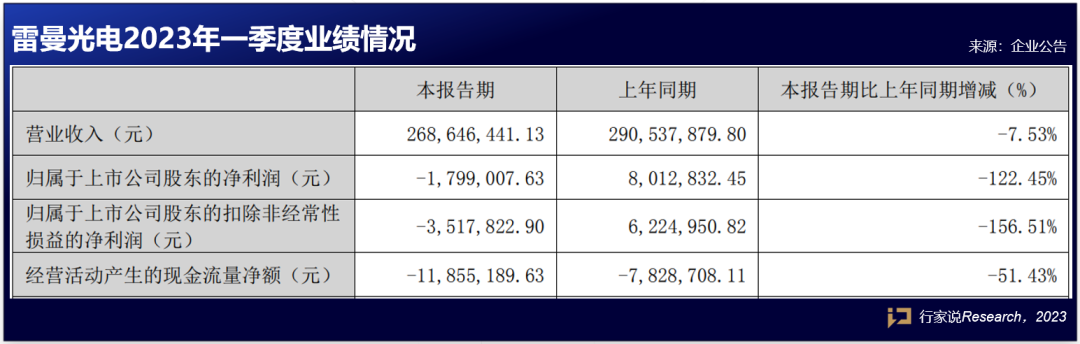 4月24日,雷曼光电发布2022年及2023年一季度财报。