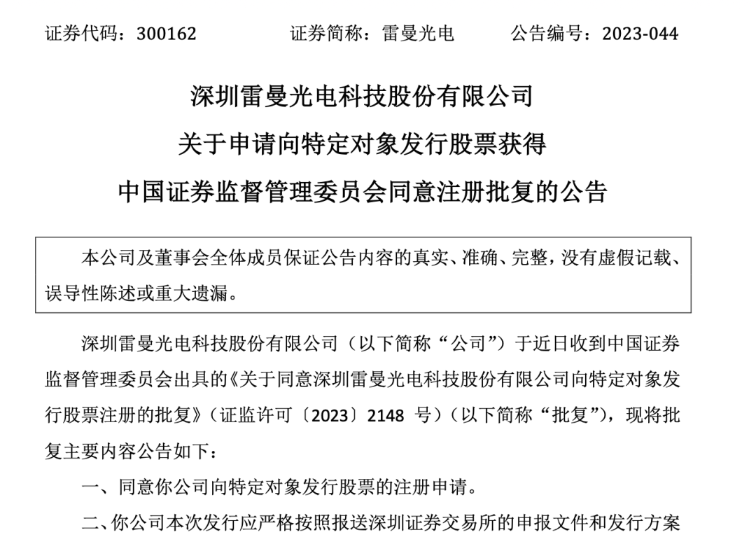 9月12日,雷曼光电提交了定增计划说明书,28日就得到了证监会的批复同意(有效期12个月内)。定增计划为不超过104,853,009股,不超过发行前总股本30%,拟计划募集不超过6.89亿。其中募集金额中,雷曼光电COB超高清显示改扩建项目约5.4亿,1.5亿补充流动资金。
