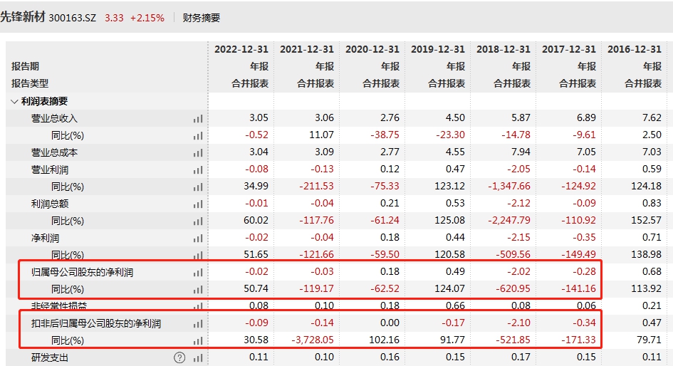 公开资料显示,卖壳重组的背后,是先锋新材的经营困境。财务数据显示,2017年至2022年的6年中,先锋新材归母净利润“四亏两盈”,6年合计亏损1.68亿元;扣非归母净利润更是有5年出现亏损。