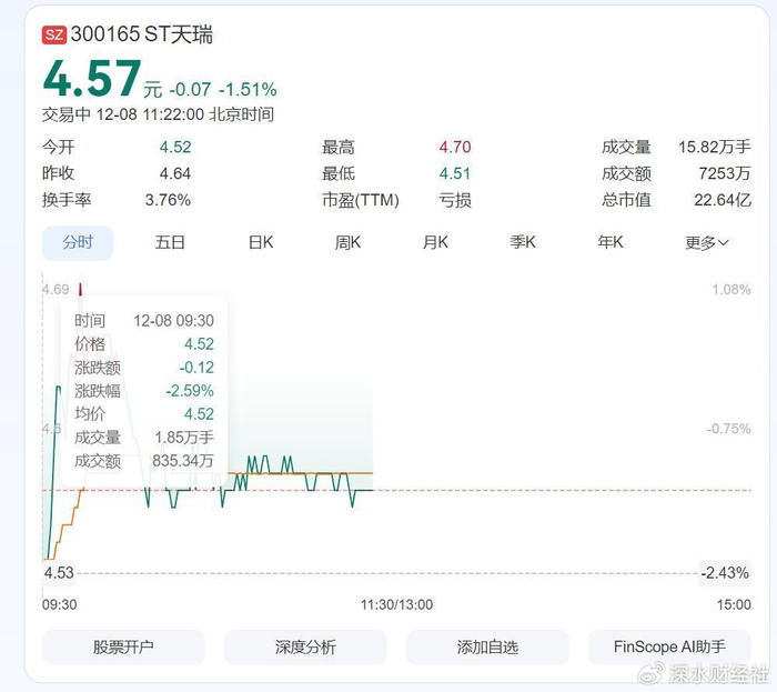 在结束了一周的停牌后, ST天瑞 (300165.SZ)于12月8日复牌,股价开盘即跌2.59%。