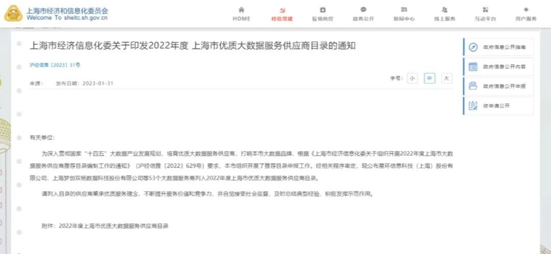 图:上海市经济信息化委印发《2022年度上海市优质大数据服务供应商目录》通知。