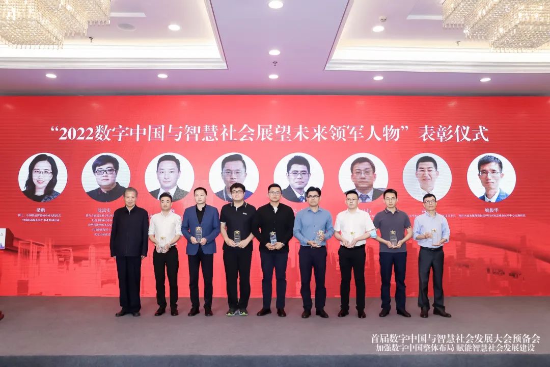 图:市民云中心常务副总裁吴健(右四)被评为“2022数字中国与智慧社会展望未来领军人物”。