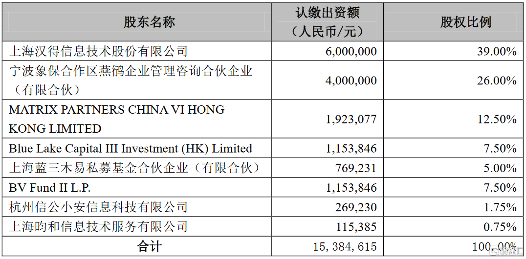 此次甄知科技增资扩股交割完成后,甄知科技的注册资本为人民币15,384,615元人民币,其股权结构如下(最后以实际工商登记所载为准):