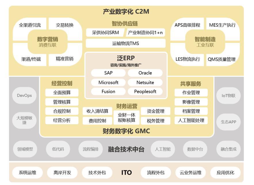 汉得信息成立于2002年7月,近年来向“软件产品+服务”的综合服务商转型升级,目前核心业务包括产业数字化、财务数字化、泛ERP和ITO。产业数字化业务主要涵盖智能制造、数字营销和智协供应链,聚焦企业产业数字化转型,公司提供自研软件产品+全面实施服务,帮助企业建立制造、营销及供应链三大数字化体系。