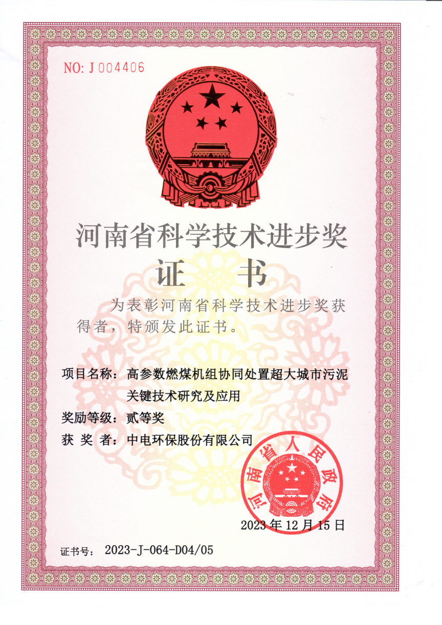 近日,公司收到河南省人民政府表彰,申报的“高参数燃煤机组协同处置超大城市污泥关键技术研究及应用”成功获评2023年度河南省科学技术进步奖二等奖。