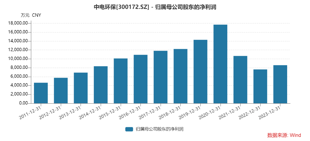 数据显示,2011-2023年,中电环保的营业收入从2.41亿元增长至10.06亿元,但是2023年营业收入同比下降1.70%;归母净利润从0.46亿元增至0.86亿元,其中2020年一度达到1.77亿元,但是2021年和2022年归母净利润均同比下降,2023年归母净利润同比增长12.55%,但是0.86亿元的数据依旧低于2015年至2020年的各年业绩。