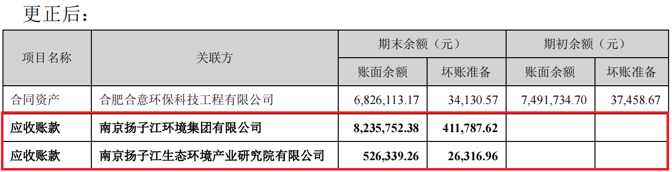 中电环保2022年年报,“购销商品、提供和接受劳务的关联交易”中,扬子江环境“提供劳务”的关联交易金额为438.96万元,而更正后的金额为2071.25万元;“关联租赁情况”中,扬子江环境“经营租赁”的95.23万元关联交易金额被错记在扬子江研究院的名下;“应收项目”中,扬子江环境的2021.59万元和扬子江研究院的52.63万元应收账款被遗漏。