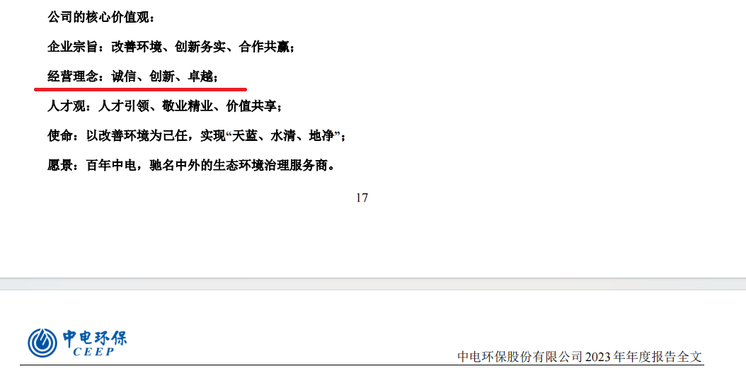 极具讽刺意味的是,中电环保2023年年报中披露的经营理念是“诚信、创新、卓越”,谁能想到这家号称“诚信”的企业连续三年财报的关联交易披露是不准确的。