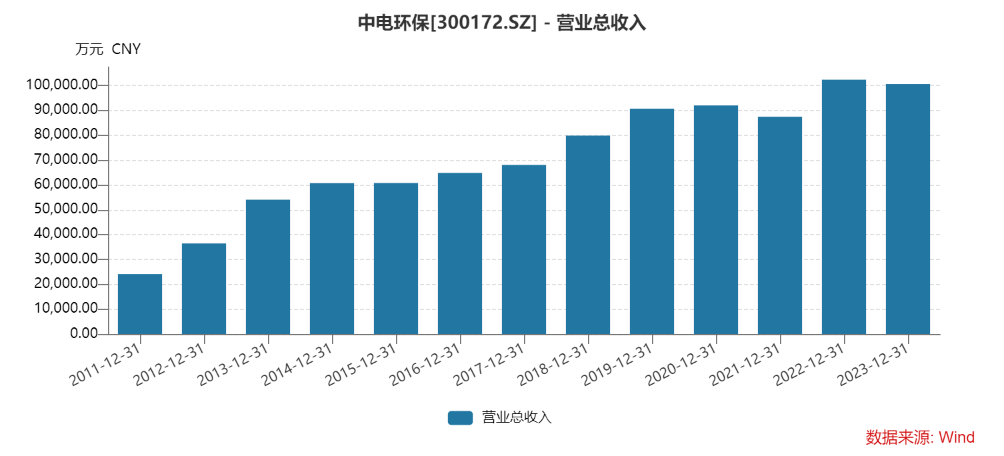 上市十余年以来,中电环保的营业收入业绩波动较大。
