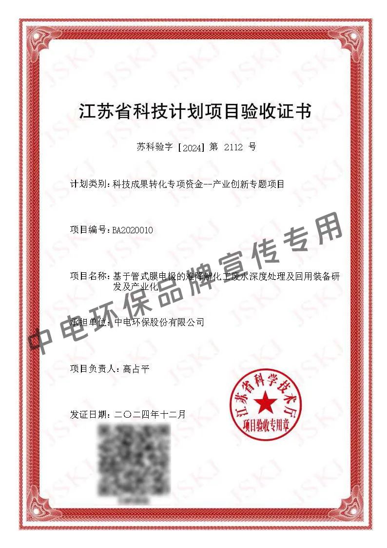 近日,我司承担的江苏省科技成果转化专项资金-产业创新专题项目“基于管式膜电极的难降解化工废水深度处理及回用装备研发及产业化”成功通过江苏省科学技术厅验收。