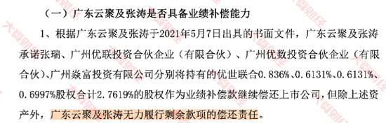 “根据广东云聚及张涛于2021年5月7日出具的书面文件,广东云聚及张涛承诺张瑞、广州优联投资合伙企业(有限合伙)、广州优数投资合伙企业(有限合伙)、广州焱富投资有限公司分别将持有的优世联合0.836%、0.6131%、0.6131%、0.6997%股权合计2.7619%的股权作为业绩补偿款继续偿还上市公司,但除上述资产外,广东云聚及张涛无力履行剩余款项的偿还责任。”在回应交易所的关注函中,朗源股份表示。