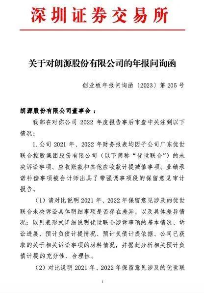 5月19日,朗源股份有限公司(以下简称“朗源股份”或“公司”)收到深圳证券交易所的年报问询函。问询函要求朗源股份对比说明2021年、2022年保留意见涉及的优世联合未决诉讼具体明细事项是否存在差异,以及具体差异情况;以列表形式详细说明优世联合涉诉事项的基本情况、诉讼进展、预计负债计提情况、预计负债计提依据、公司已获取的关于相关诉讼事项的材料情况,并据此分析相关预计负债计提的充分性、合理性等。