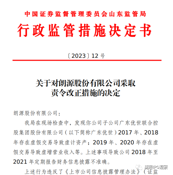 文件显示,山东证监局在现场检查中,发现朗源股份子公司广东优世联合控股集团股份有限公司2017年、2018年存在虚假交易导致虚计资产;2019年、2020年存在虚假交易导致虚增营业收入等。上述事项导致公司2018年至2021 年定期报告财务信息披露不准确。
