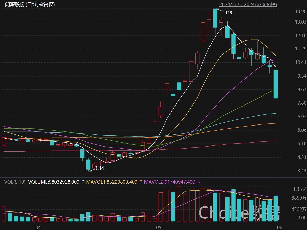 有意思的是,自“靴子落地”之后,朗源股份股价便掉转方向不断下探。截至发稿时,公司股价较前期13.90元/股的高点大幅回落超过四成。