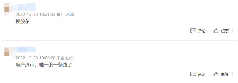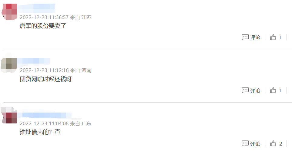 有股民评论称,“唐军的股份要卖了”“谁批借壳的?查”“换股东”“破产退市,唯一的一条路了”“感觉跑不出去了”……