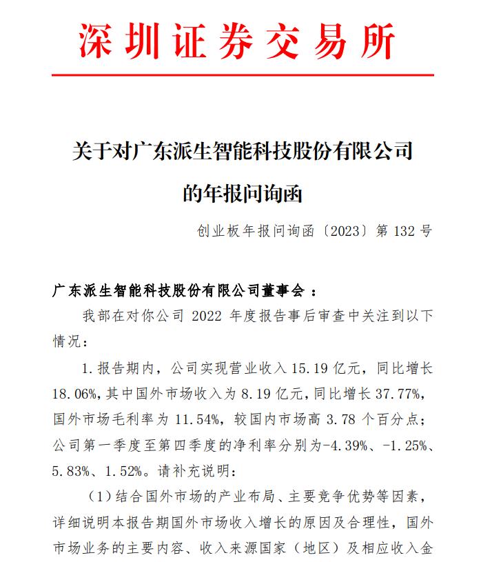 年报问询函显示,派生科技2022年实现营业收入15.19亿元,同比增长18.06%,其中国外市场收入为8.19亿元,同比增长37.77%,国外市场毛利率为11.54%,较国内市场高3.78个百分点;公司第一季度至第四季度的净利率分别为-4.39%、-1.25%、5.83%、1.52%。