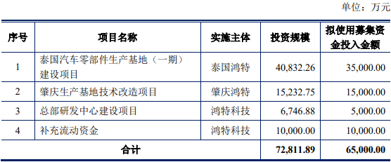 本次配股募集资金不超过人民币65,000万元(具体规模视发行时市场情况而定),在扣除相关发行费用后将全部用于以下项目:泰国汽车零部件生产基地(一期)建设项目、肇庆生产基地技术改造项目、总部研发中心建设项目、补充流动资金。