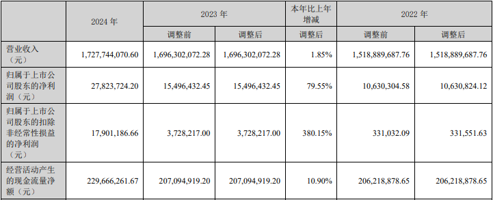 2019年至2024年,鸿特科技的营业收入分别为15.10亿元、11.73亿元、12.87亿元、15.19亿元、16.96亿元、17.28亿元;归属于上市公司股东的净利润分别为-4.28亿元、2088.17万元、-4751.66万元、1063.08万元、1549.64万元、2782.37万元;归属于上市公司股东的扣除非经常性损益的净利润分别为-4.27亿元、1047.26万元、-5268.12万元、33.16万元、372.82万元、1790.12万元。