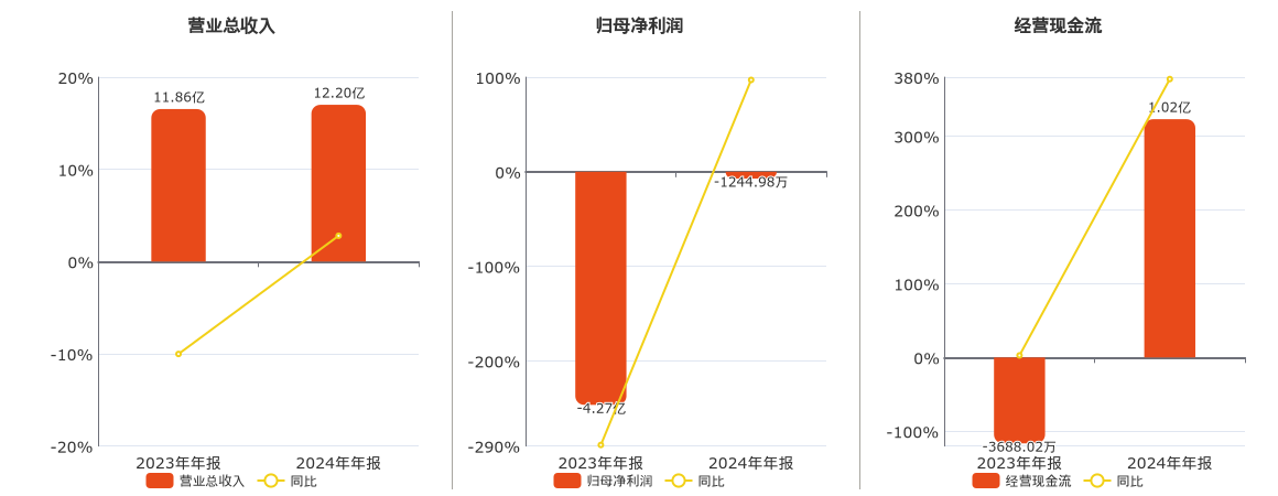 公司营业总收入为12.20亿元。归母净利润为-1244.98万元。经营活动现金净流入为1.02亿元。