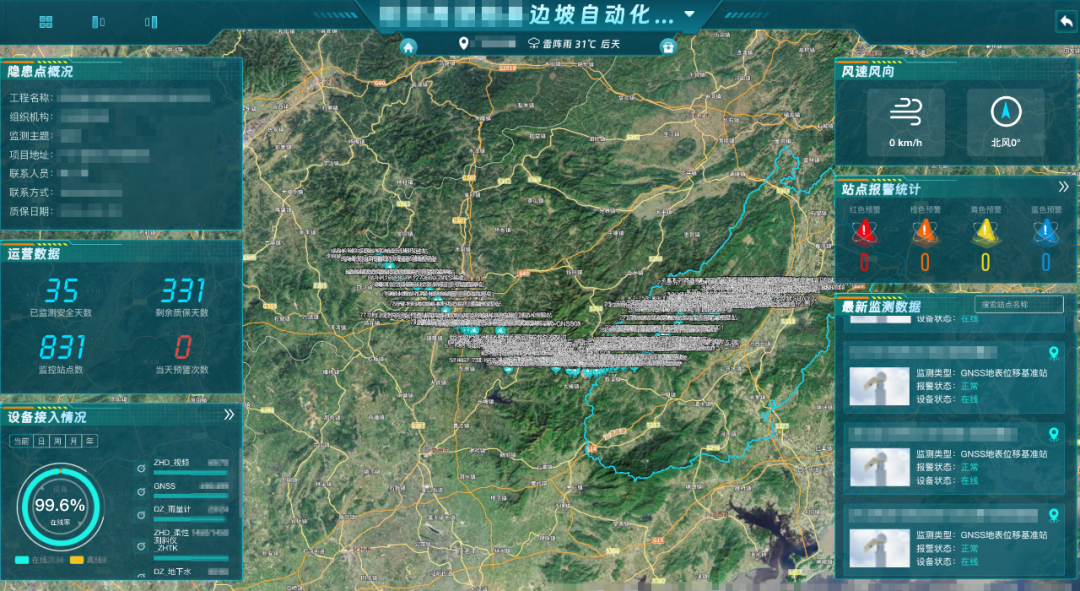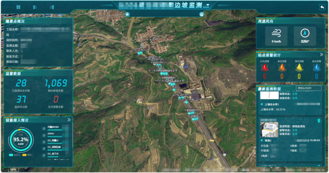 沿线地形地质条件复杂,涉及高填方、高陡坡、深挖路堑高边坡等多种工程场景。通过安装北斗位移监测站、倾角加速度计、雨量计、测斜仪、地下水监测仪、视频监测站、机器视觉位移计等500多套监测设备,实现了边坡表面和深部位移、倾角、振动、雨量等全方位监测。当边坡出现失稳征兆或发生滑坡时,设备监测数据将实时传输到安全监测预警管理平台并发出预警信息,有效降低或避免安全事故的发生。
