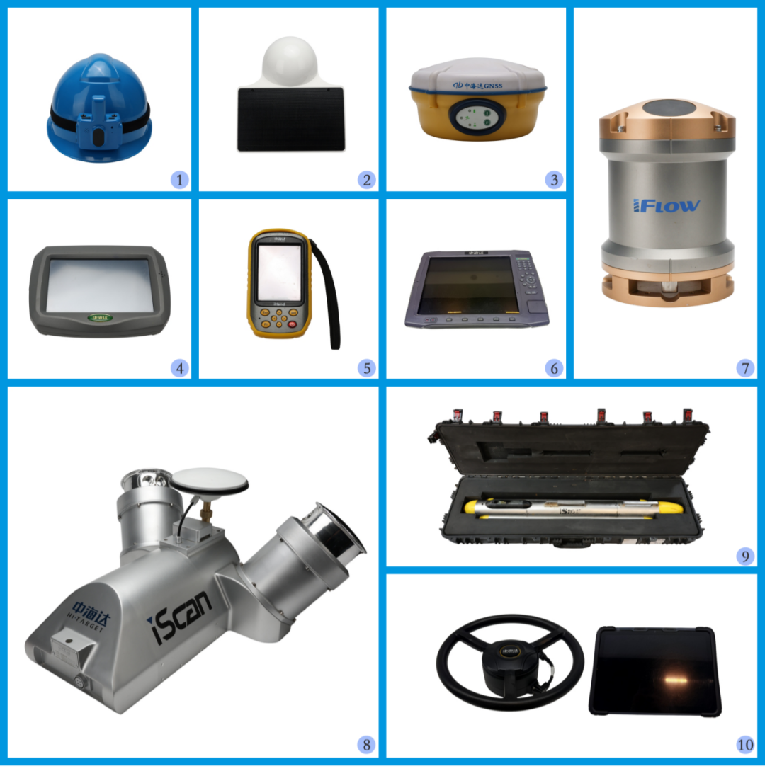 ①北斗安全帽②MS 100北斗监测站③V8 GNSS接收机④机械控制平板终端⑤iHand18G手薄⑥HD370测深仪⑦iFlow RP1200声学多普勒流速剖面仪 ⑧车载移动测量系统iScan-S-Z ⑨iSide系列侧扫声呐 ⑩农机导航控制系统