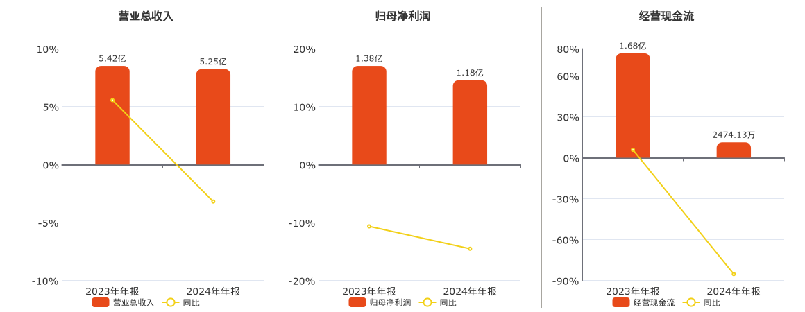 公司营业总收入为5.25亿元,较去年同报告期营业总收入减少1730.30万元,同比较去年同期下降3.19%。归母净利润为1.18亿元,较去年同报告期归母净利润减少1997.10万元,同比较去年同期下降14.52%。经营活动现金净流入为2474.13万元,较去年同报告期经营活动现金净流入减少1.43亿元,同比较去年同期下降85.25%。
