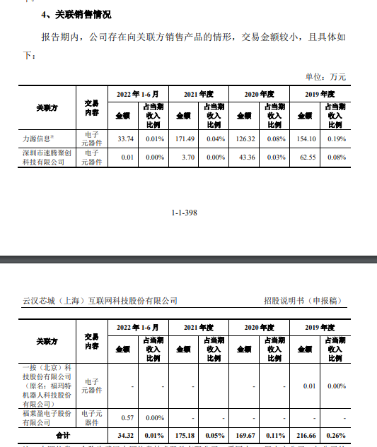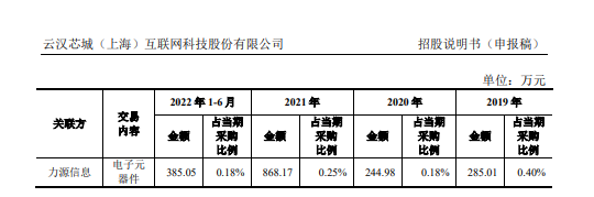 作为云汉芯城的主要股东,力源信息也是公司合作已久的客户、供应商,在力源信息2014年报、2015年报就曾披露双方关联销售、关联采购的情况。2019年~2021年及2022年1~6月,云汉芯城对力源信息的关联采购金额分别为285.01万元、244.98万元、868.17万元、385.05万元,关联销售金额分别为154.1万元、126.32万元、171.49万元、33.74万元。