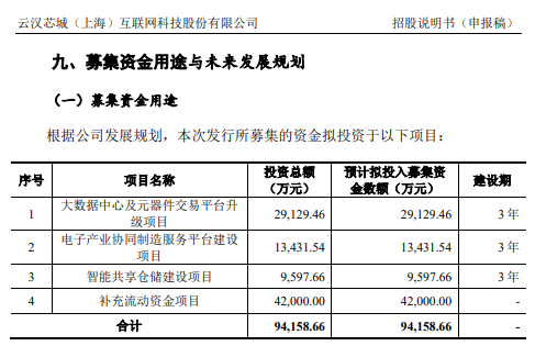 按照IPO计划,云汉芯城拟募集资金9.42亿元,其中最大募投项目为“补充流动资金”,拟投入募集资金4.2亿元。