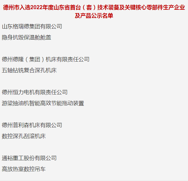 7月13日,省工信厅对2022年度山东省首台(套)技术装备及关键核心零部件生产企业及产品名单进行了公示,全省共有277家企业及产品。德州市20家企业及产品成功入选,区内企业通裕重工入选。
