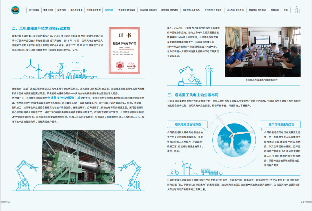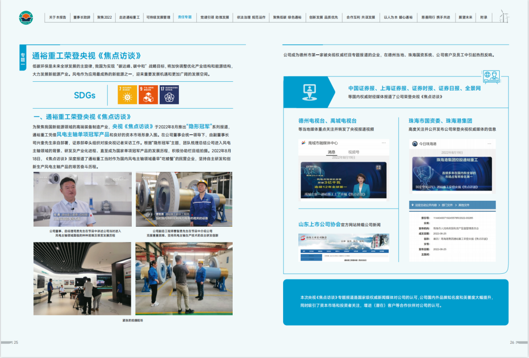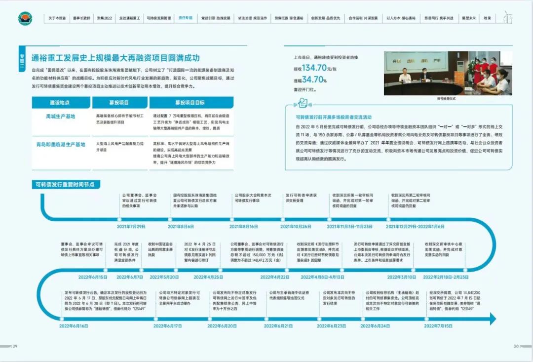 2023年4月,通裕重工股份有限公司(以下简称“公司”)发布了第二份环境、社会及管治(ESG)报告,持续梳理和优化ESG治理架构,完善ESG相关管理制度,逐步将ESG理念融入公司经营战略,充分体现了公司对可持续发展的重视和履行社会责任的决心。未来公司将继续致力于风电、水电、火电、核电等清洁能源领域装备及产品的研发、制造及销售,助力我国清洁能源产业的快速发展和“双碳”目标的实现。本次ESG报告共包括“党建引领助推发展”“依法治理规范运作”“聚焦低碳绿色通裕”“创新发展品质优先”“合作互利共谋发展”“以人为本暖心通裕”“慈善同行携手共进”七个章节及“通裕重工荣登央视《焦点访谈》”“通裕重工发展史上规模最大再融资项目圆满成功”两个专题,旨在全面展示公司在ESG方面的表现及为可持续发展而做出的不懈努力。
