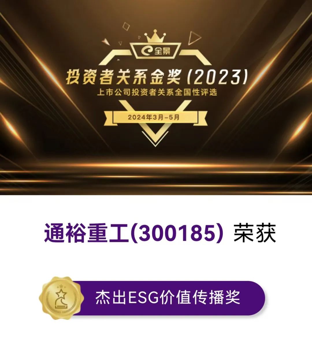 近日,由深圳市全景网络有限公司主办、南开大学中国公司治理研究院共同推出的“第五届全景投资者关系金奖”全国性评选,经过专家顾问组最后环节的评审,金奖榜单正式揭晓!通裕重工荣获“全景投资者关系金奖(2023)杰出ESG价值传播奖”,体现了权威媒体对公司投资者关系管理和价值传递工作的高度认可。