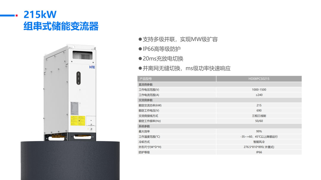 交流侧则采用了4台215kW组串式储能变流器,支持300+Ah的大容量电池。通过大功率、高效率的模块化PCS与大容量、高能量密度的电芯相结合,可显著降低系统全生命周期成本。此外,该变流器还具备构网型GFM功能,能够主动支撑电网,并灵活参与电力市场调度。