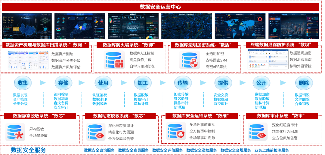 一套以“服务+产品”模式,为客户提供全方位的数据安全咨询、安全建设和安全运营的解决方案。方案包含据资产分类分级、数据脱敏、数据加密、数据库审计、数据库防火墙、数据库运维安全防护、终端数据防泄漏、数据销毁等多款产品和服务。尤其是数据安全运营中心涵盖了资产测绘、风险感知、策略编排、联防联控等核心功能,为客户提供全面的数据安全保障。