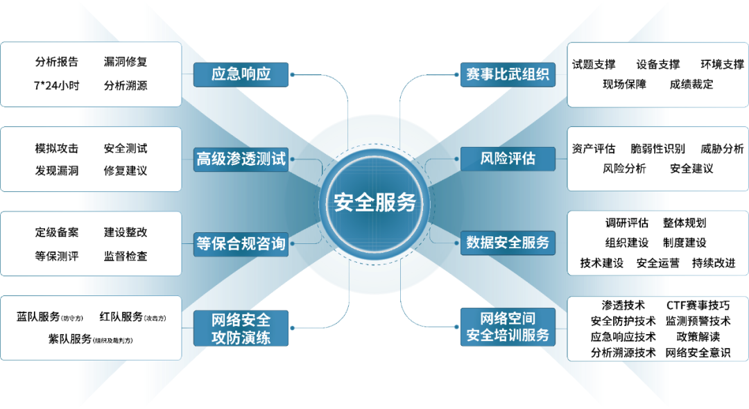 美亚柏科在网络空间安全板块,拥有一支人员结构完整、实战经验丰富的攻防团队,能够提供高级渗透测试、网络安全攻防演练、数据安全服务、等保合规咨询、风险评估、应急响应、赛事与比武组织、网络空间安全培训等高质量网络安全服务。