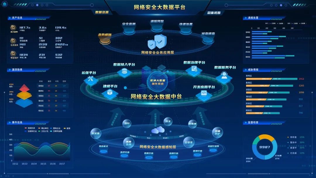 一款通过对海量多源异构数据进行建模分析、深度挖掘,以实现对全网资产、漏洞或事件的态势感知、威胁检测、通报预警及溯源取证的平台。平台利用大数据+人工智能为实现网络安全业务“一图知全貌、一览众山''晓''”的目标提供落地保障。