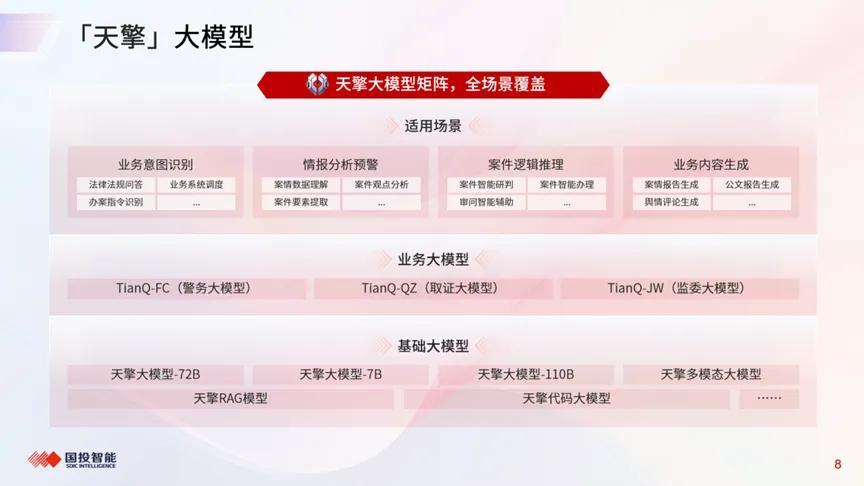 作为网络空间安全与社会治理领域国家队,国投智能始终致力于探索大模型技术的前沿应用。基于自主研发的行业大模型“天擎”和大模型应用创新平台Qiko,构建了完整的大模型技术体系,为千行百业的智能化升级提供强大动力。同时,公司依托在深度合成和生成式AI技术领域的优势,积极开展人工智能大模型技术的深度探索,并推出了一系列智能装备和产品,为有效打击利用AI技术进行的违法犯罪行为提供了有力的技术保障。