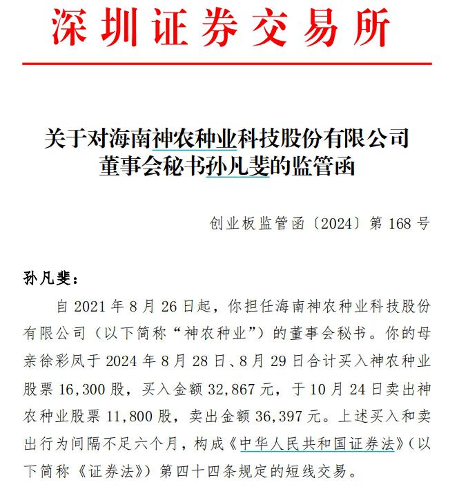 深交所监管函称,自2021年8月26日起,孙凡斐担任神农种业董事会秘书。孙凡斐的母亲徐彩凤于2024年8月28日、8月29日合计买入神农种业股票16300股,买入金额32867元,于10月24日卖出神农种业股票11800股,卖出金额36397元。