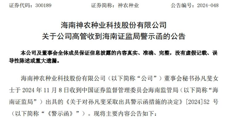 11月8日,神农种业董秘孙凡斐女士收到深交所监管函。同日公司公告称,董秘收到海南证监局出具的警示函。