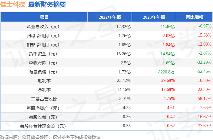 近期佳士科技(300193)发布2023年年报。根据财报显示,本报告期中佳士科技净利润增15.38%,三费占比上升明显。截至本报告期末,公司营业总收入11.46亿元,同比下降6.97%,归母净利润2.03亿元,同比上升15.38%。按单季度数据看,第四季度营业总收入2.9亿元,同比下降19.99%,第四季度归母净利润3711.13万元,同比上升13.98%。