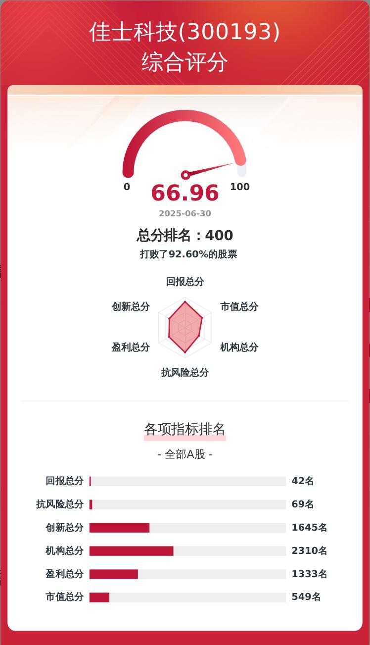金融界上市公司研究院构建了一套上市公司韧性评价体系,从企业盈利、科技创新、股东回报、经营抗风险、市值表现及机构吸引力六个维度对企业进行量化评分,满分为100分。佳士科技的韧性评价总分为66.96分,在A股5405家可比上市公司中排名第400位。