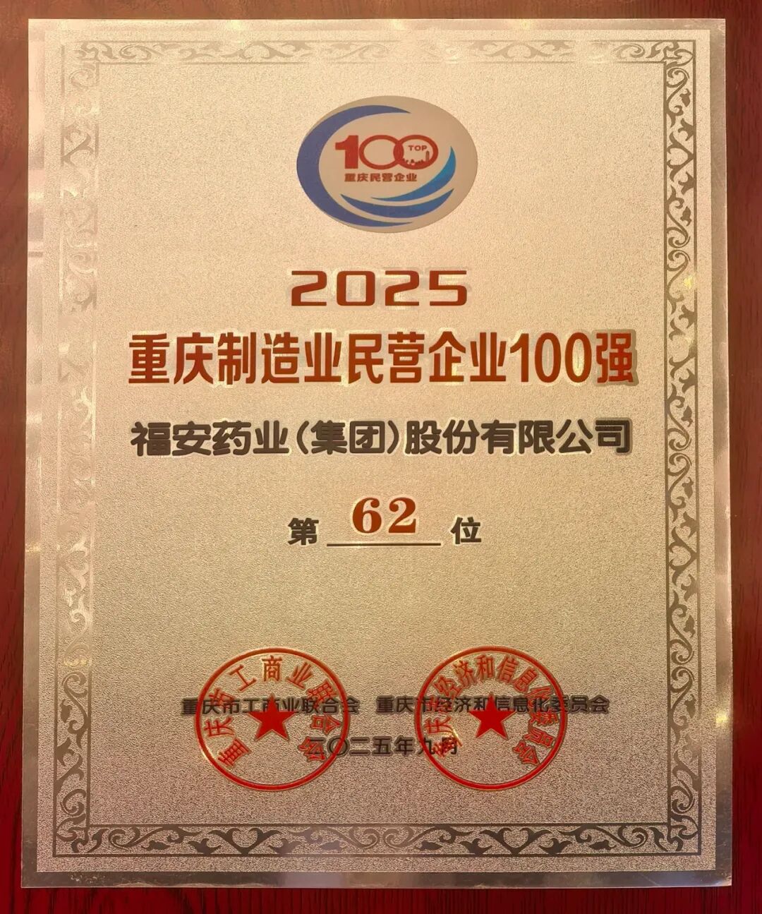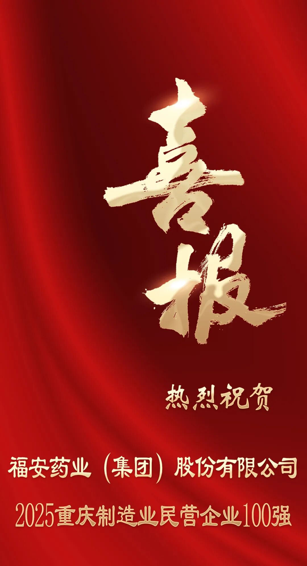 热烈祝贺:福安药业集团荣获2025重庆制造业民营企业100强