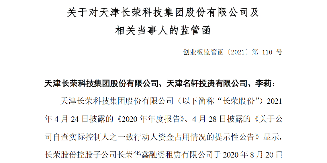 投研电讯信披质量研究员发现,6天前即2021年8月5日,因长荣股份2020年年报和《关于公司自查实际控制人之一致行动人资金占用情况的提示性公告》显示,公司控股子公司长荣华鑫于2020年8月20日向长荣股份控股股东、实际控制人李莉的一致行动人名轩投资拆出资金2,000万元,用于偿还金融机构借款,形成非经营性资金占用。2020年8月26日,名轩投资归还占用款项;2021年4月28日,名轩投资支付相应利息2.63万元,上述行为违反了深交所《创业板股票上市规则》和《创业板上市公司规范运作指引》相关规定,深交所向长荣股份、李莉、名轩投资出具监管函,要求其充分重视上述问题,吸取教训,及时整改,杜绝上述问题的再次发生。
