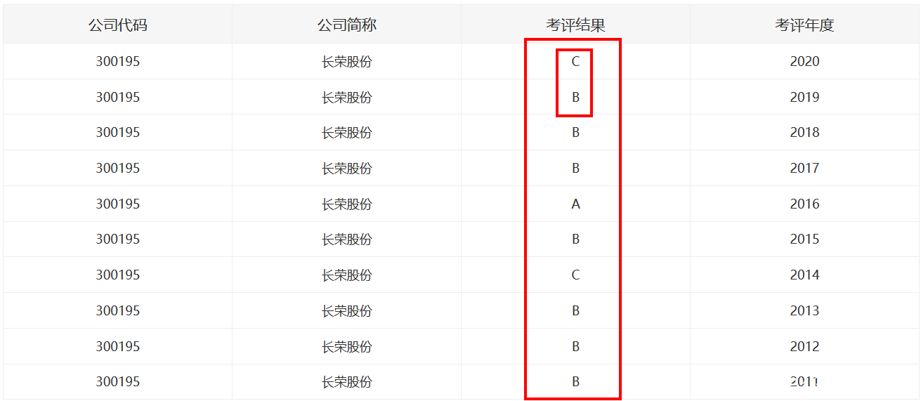 据投研电讯信披质量研究院统计,自2011年3月29日在深交所上市,长荣股份在深交所10次年度信息披露考评中,1次为A、7次为B、2次为C。投研电讯信披质量研究员发现,长荣股份在最新的2020年度信息披露考评由2019年度的B下降为C。