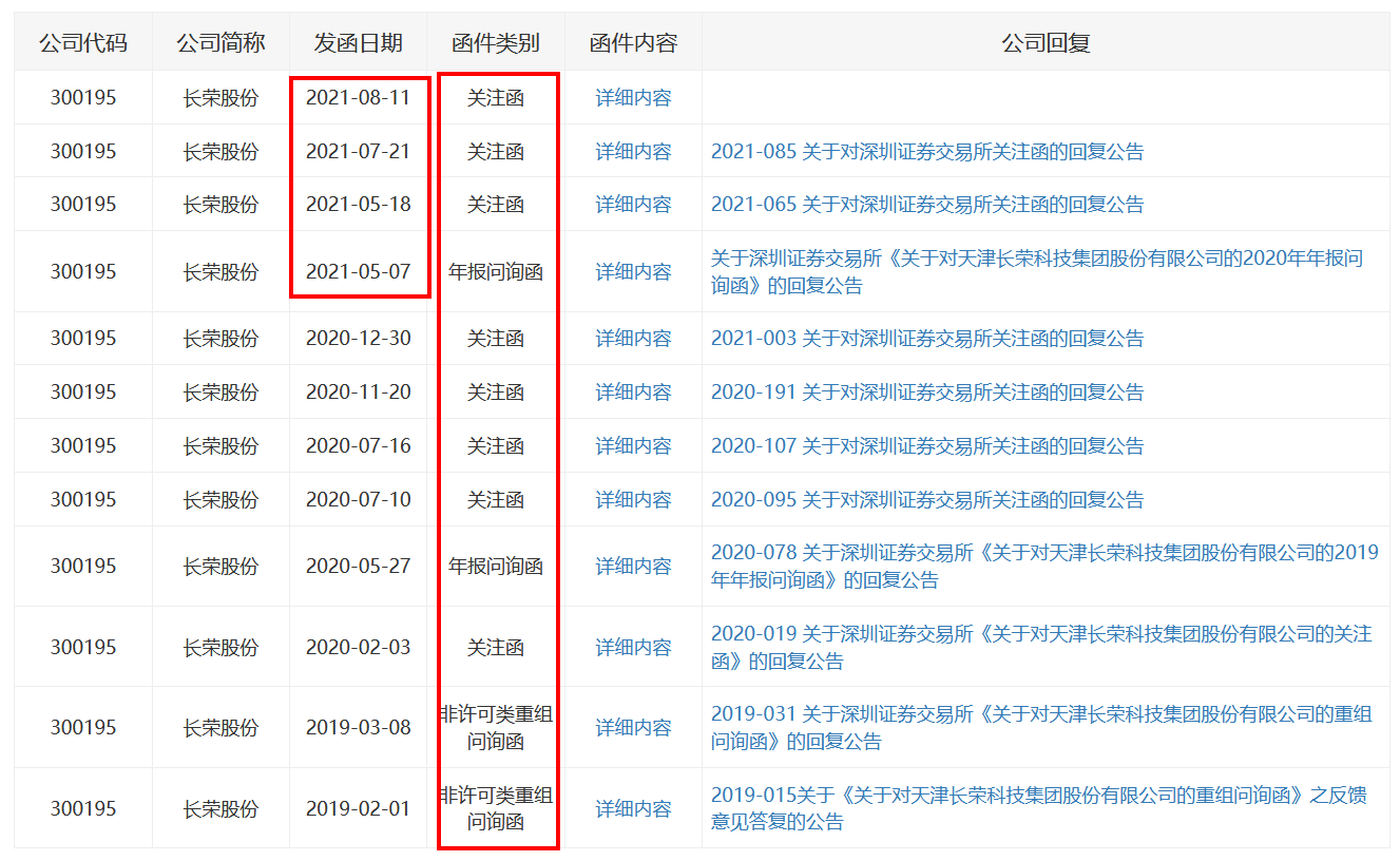 8月11日,长荣股份(300195.SZ)收到深交所出具的关注函,要求长荣股份核实并说明是否存在主动蹭热点炒作股价的情形等事项,在2021年8月13日前将有关书面说明材料报送深交所并对外披露,并抄送天津证监局上市公司监管处。