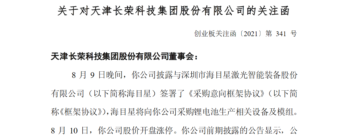 深交所关注函指出,8月9日晚间,长荣股份披露与深圳市海目星激光智能装备股份有限公司签署了《采购意向框架协议》,海目星将向长荣股份采购锂电池生产相关设备及模组。8月10日,长荣股份股价开盘涨停。公司前期披露的公告显示,长荣股份业务涉及印刷设备、口罩等疫情防护用品、区块链应用平台。