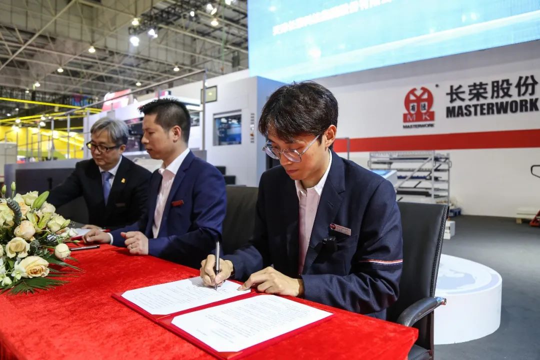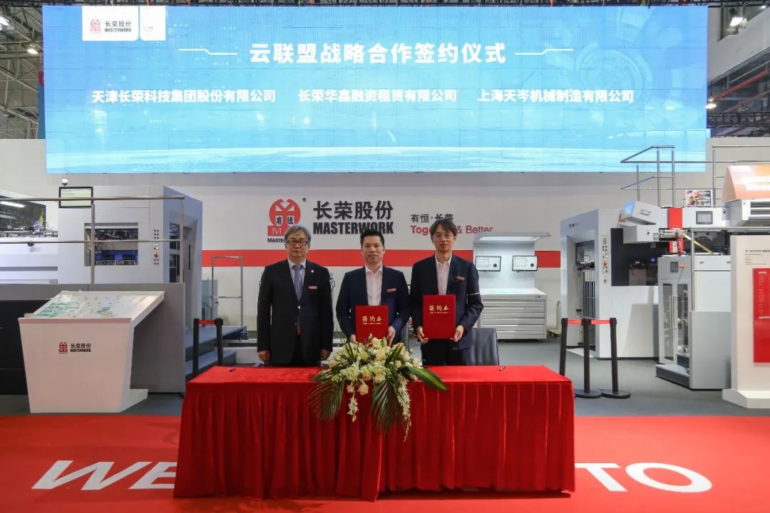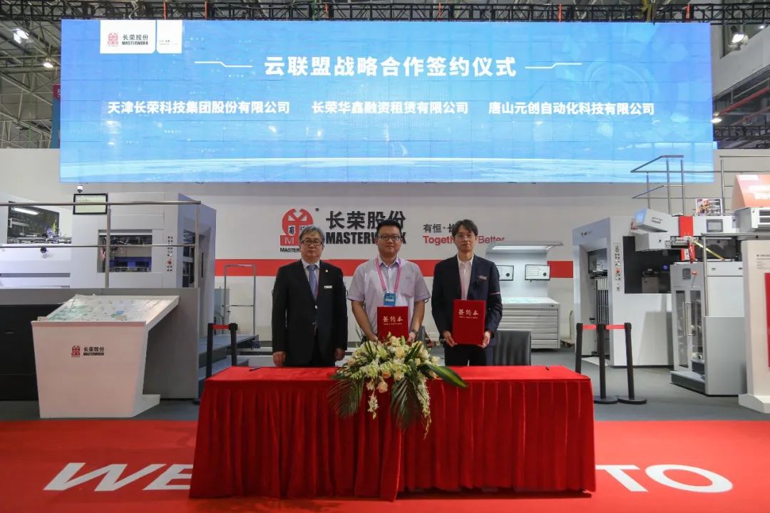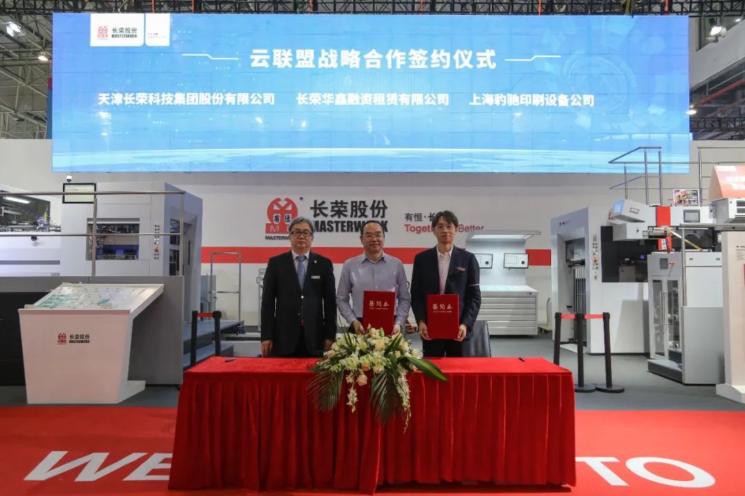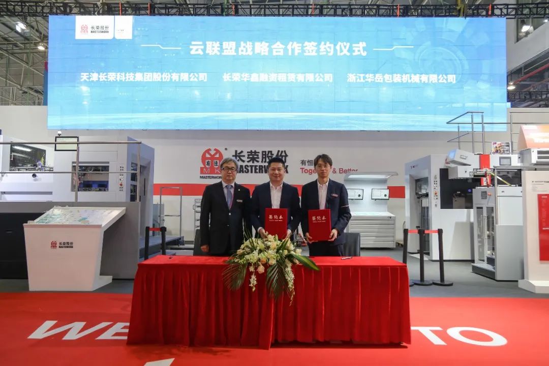 4月13日,在第五届广印展现场,天津长荣科技集团股份有限公司(简称“长荣集团”)、长荣华鑫融资租赁有限公司与浙江华岳包装机械有限公司、上海豹驰印刷设备公司、上海天岑机械制造有限公司、唐山元创自动化科技有限公司举行了“云联盟战略合作签约仪式”。